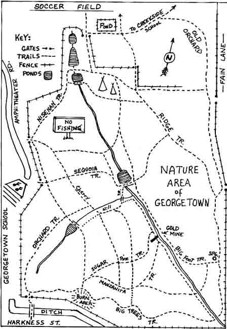 You don’t even have to leave town to enjoy some pleasant nature hiking. This 30 acre park behind the Georgetown school is crowded with paths to explore. The nature area has lots to see with its creeks, ponds, meadows, an Indian village, an old mining tunnel, and many different abandoned fruit trees mixed amongst its natural forest vegetation.