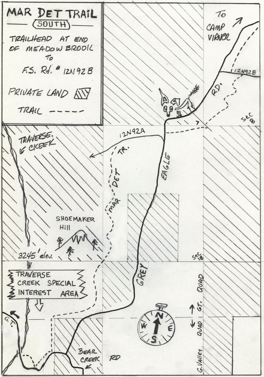 Built by a Marine Detachment in 1988 as an equestrian trail to connect the Traverse Creek Special Interest Area at the end of Meadowbrook Road to Camp Virner. Horse lovers could now reward themselves with a margarita after a six mile hot and dusty ride. Not the most scenic trail for hiking except for some views near the Traverse Creek end, the trail goes through miles of logged over forest, follows some roads, and ends up at the restaurant 6 miles above Georgetown. Connections are also possible to access the Dru Barner campground near the Balderson corral.