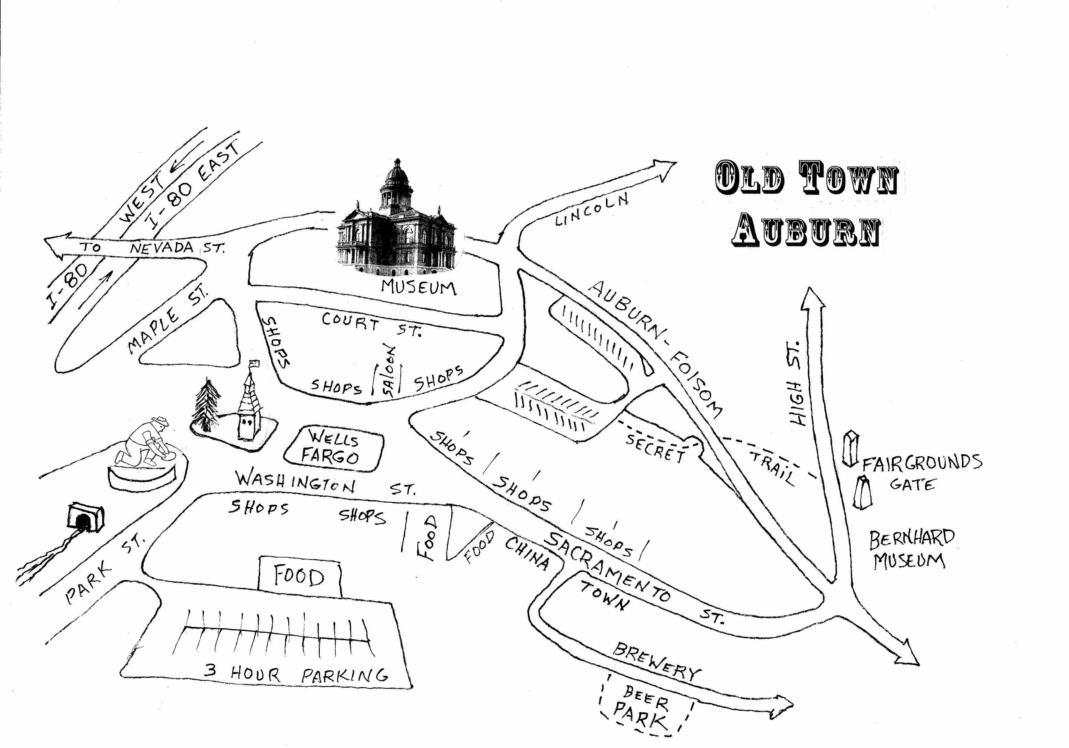 The oldest part of Auburn is west of the courthouse along the Auburn Ravine supposedly where Claude Chana first found gold and earned his claim to local fame. His statue, made by the local Dr. Fox continues to welcome visitors to town at Maple Street and Interstate 80. Dr. Fox has other big statues around Auburn; his giant Chinese coolie at Lincoln and Highway 49 (towards Placerville), and his titans along Auburn Ravine road near Palm.