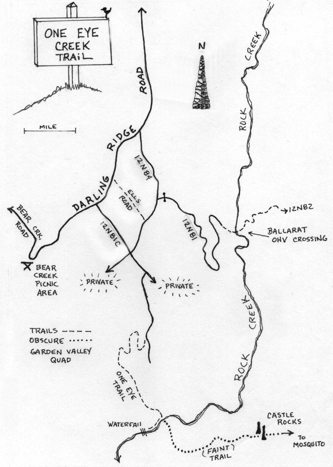 Legend has it that a miner working his claim down on Rock Creek long ago survived an attack by a mountain lion, but lost one eye during the encounter; hence the name. But One Eye Creek is downstream quite a ways beyond this trail, but perhaps in olden days it was the way to get there.