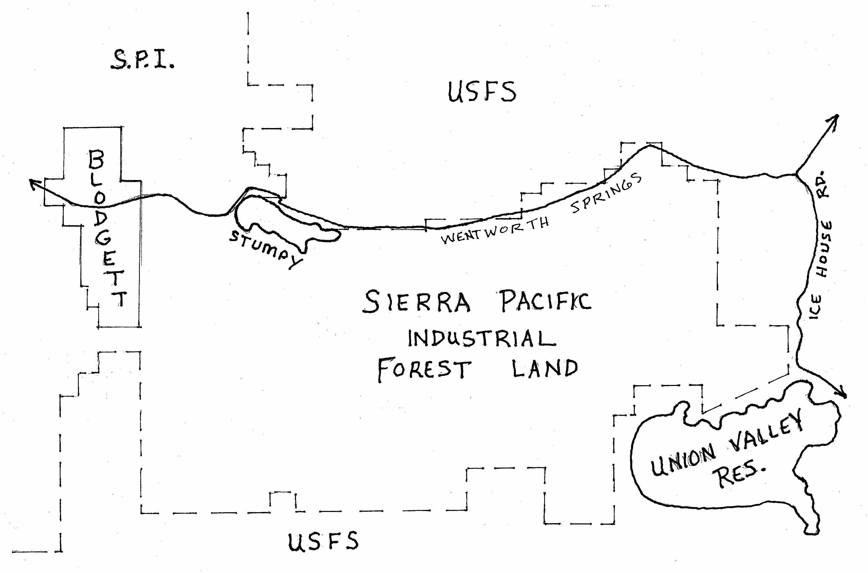Mich-Cal closed the old historic and public road which extended the Mosquito Rd. from Sand Mt. Blvd. all the way to Wentworth Springs Rd. above Stumpy Meadows in the 1980’s. This route, known as The King’s Meadow Highway, denies access to U.S.F.S. land now locked behind gates. The closure was protested to no avail. Just look at an El Dorado National Forest map to see all the public land difficult to get to with the roads closed (its shown in green within the S.P.I. white sections).